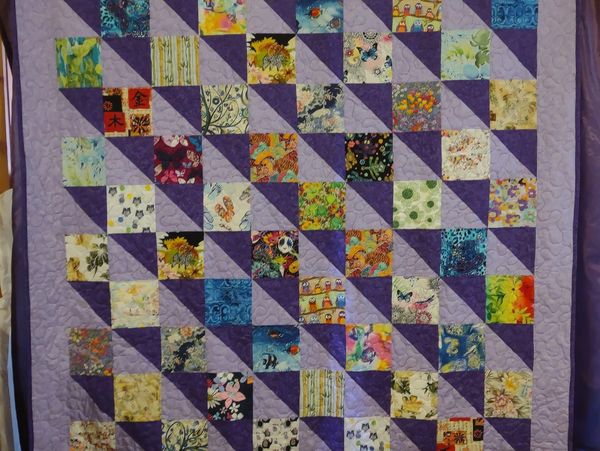 This quilt was made for a retired nurse using her colorful scrubs. I loved cutting the squares and piecing the quilt because they made me smile. Purple is her favorite color.